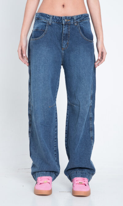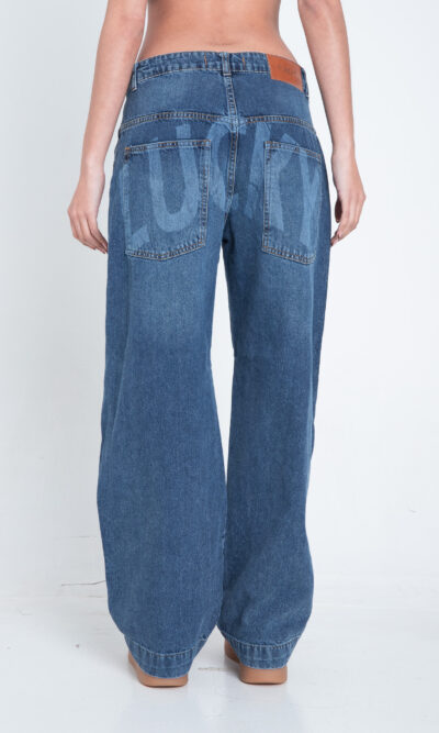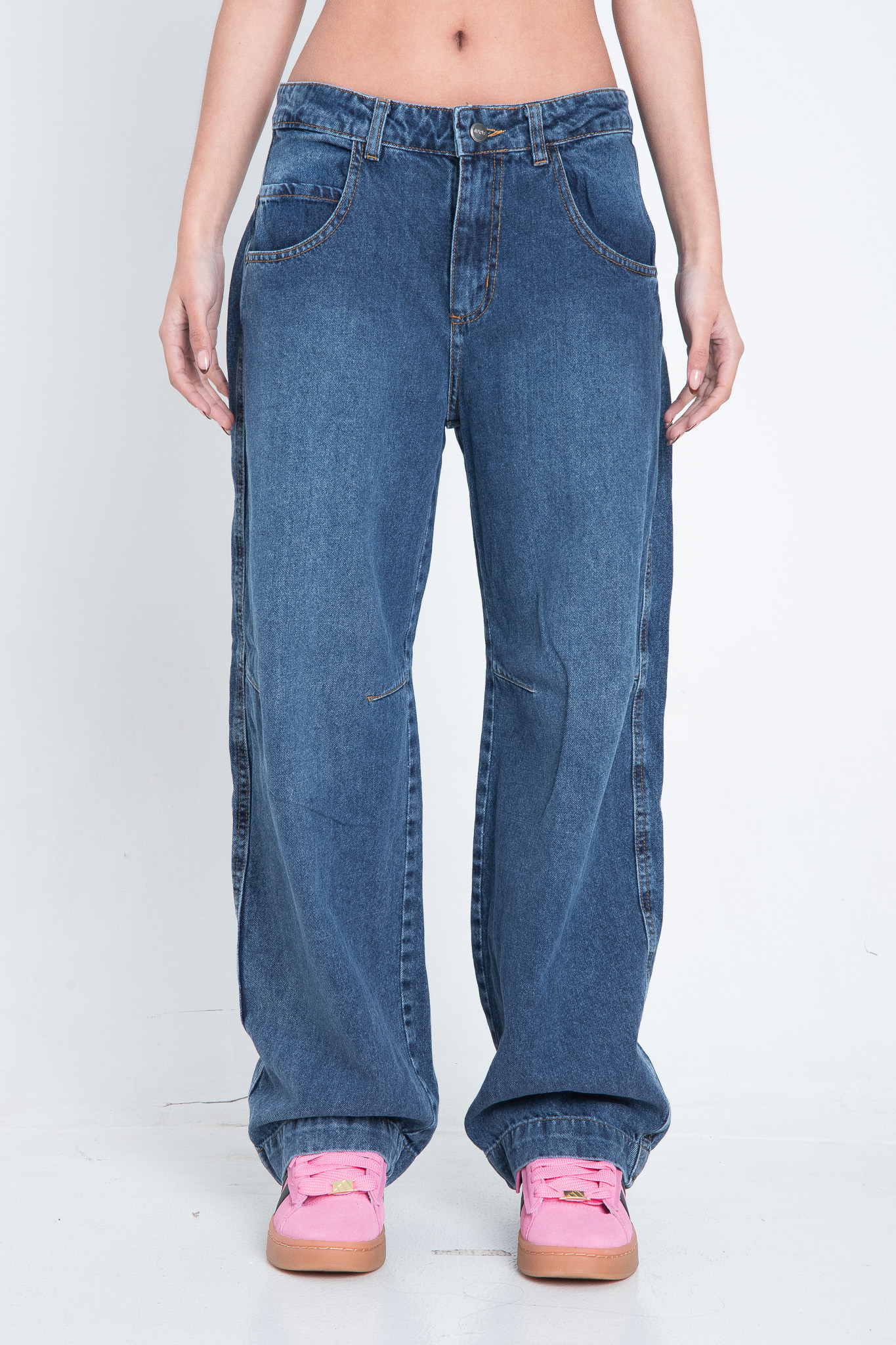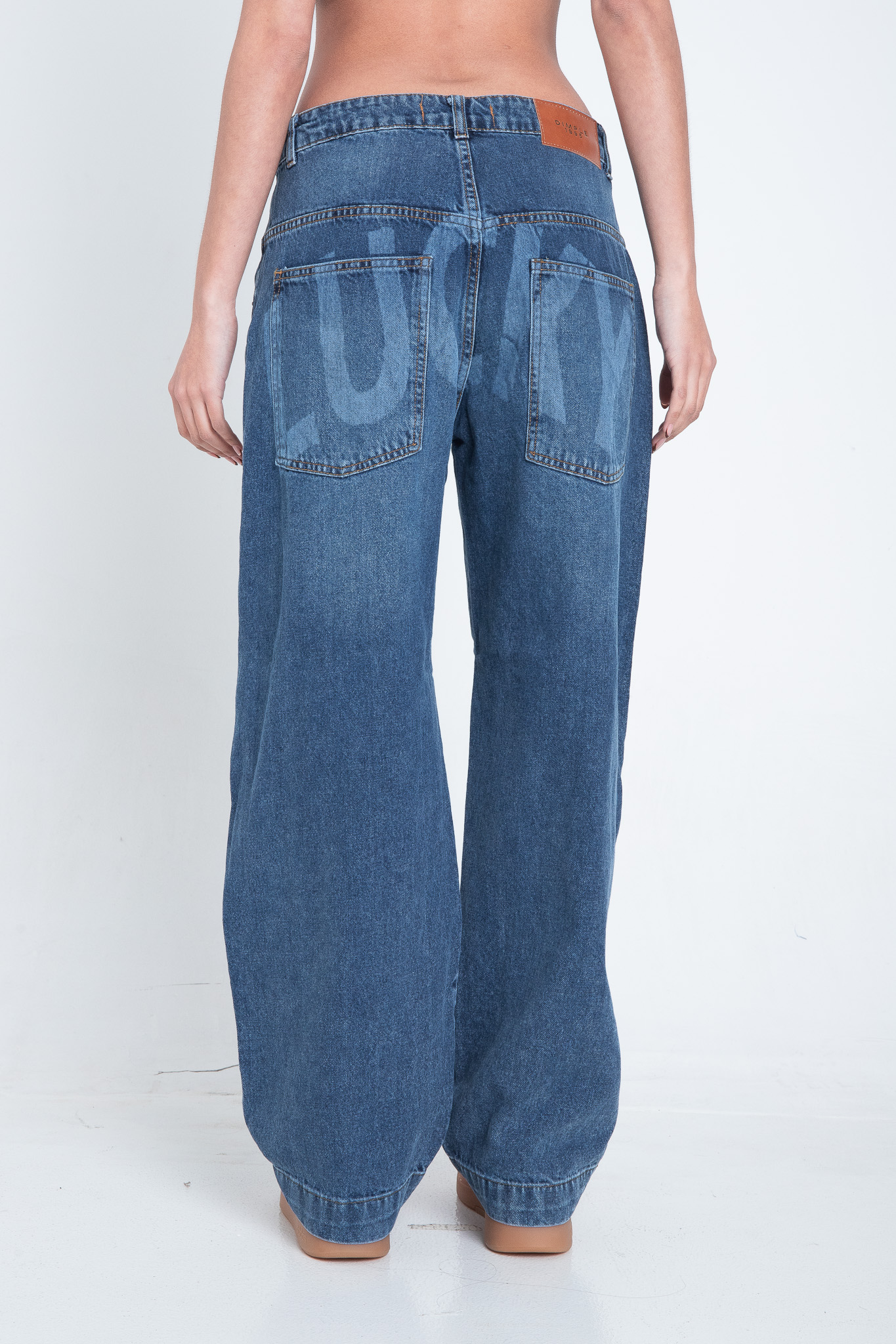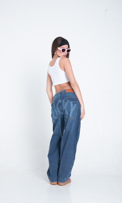 Baggy azul con pinzas, diseño laser en parte trasera, tiro medio. Rigido.