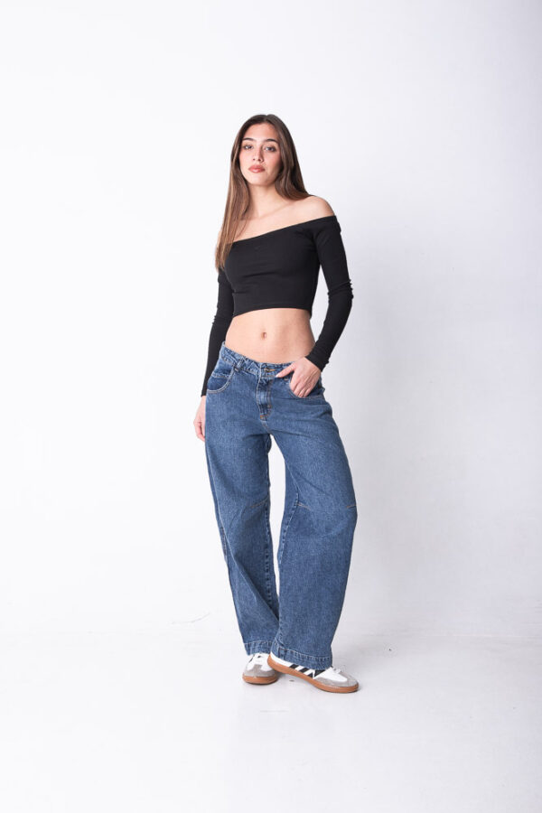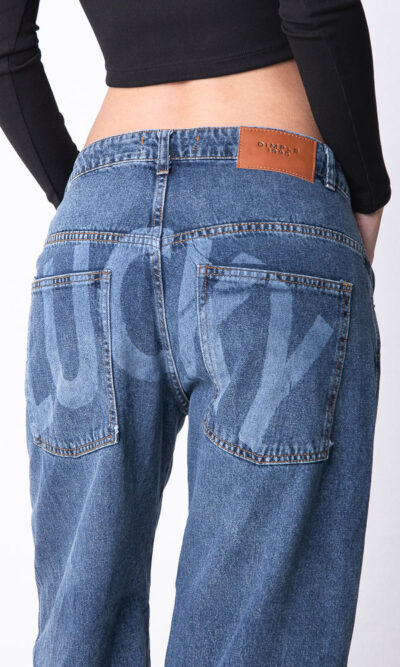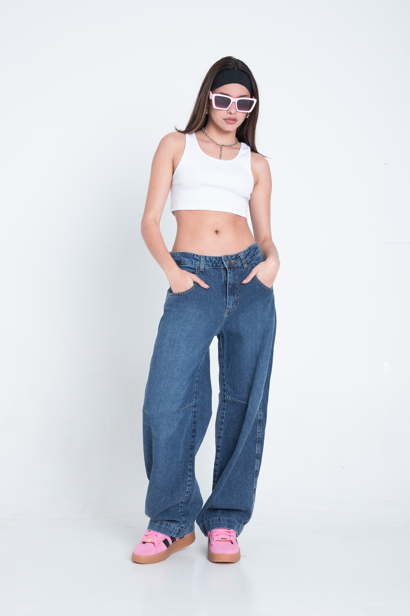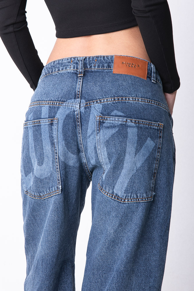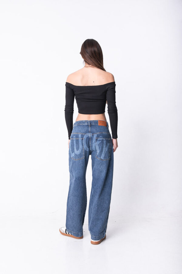 Baggy azul con pinzas, diseño laser en parte trasera, tiro medio. Rigido.
