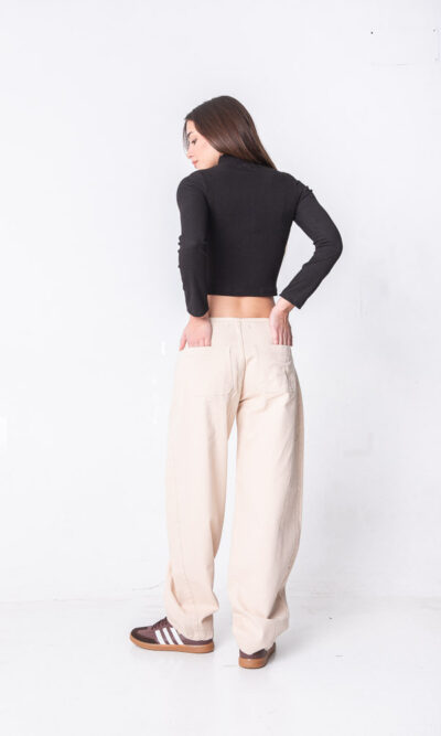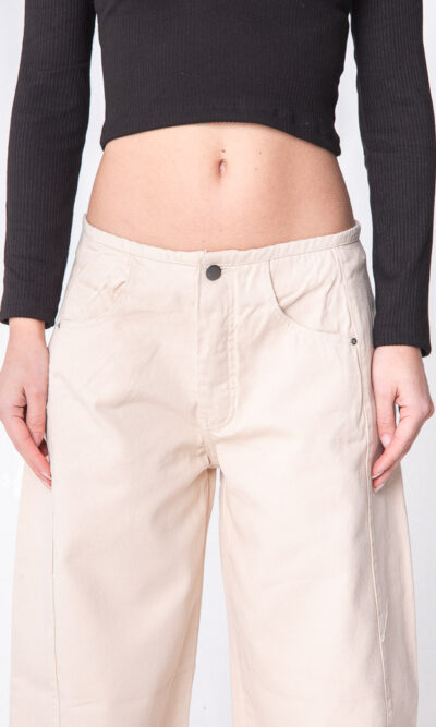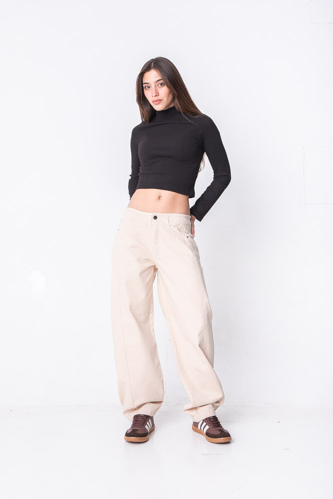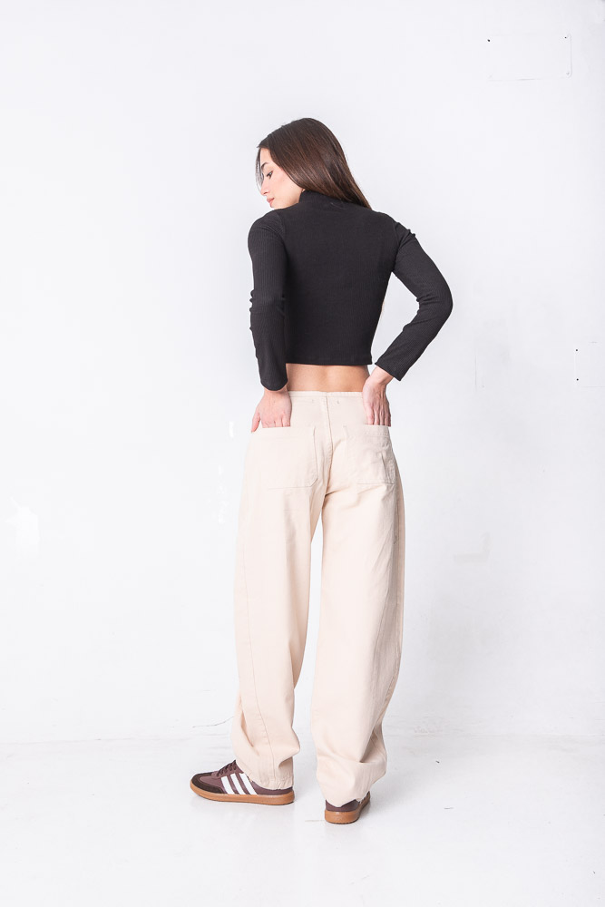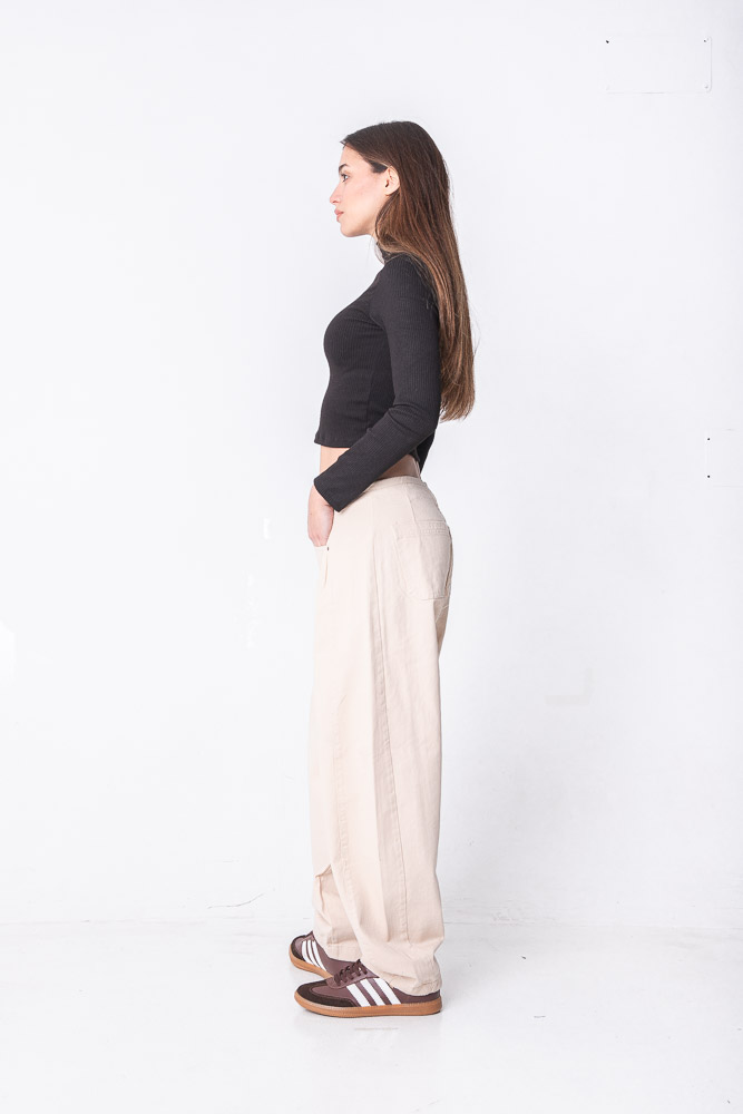 Balloom beige, tiro medio, sin cintura, con recorte lateral. Rígido