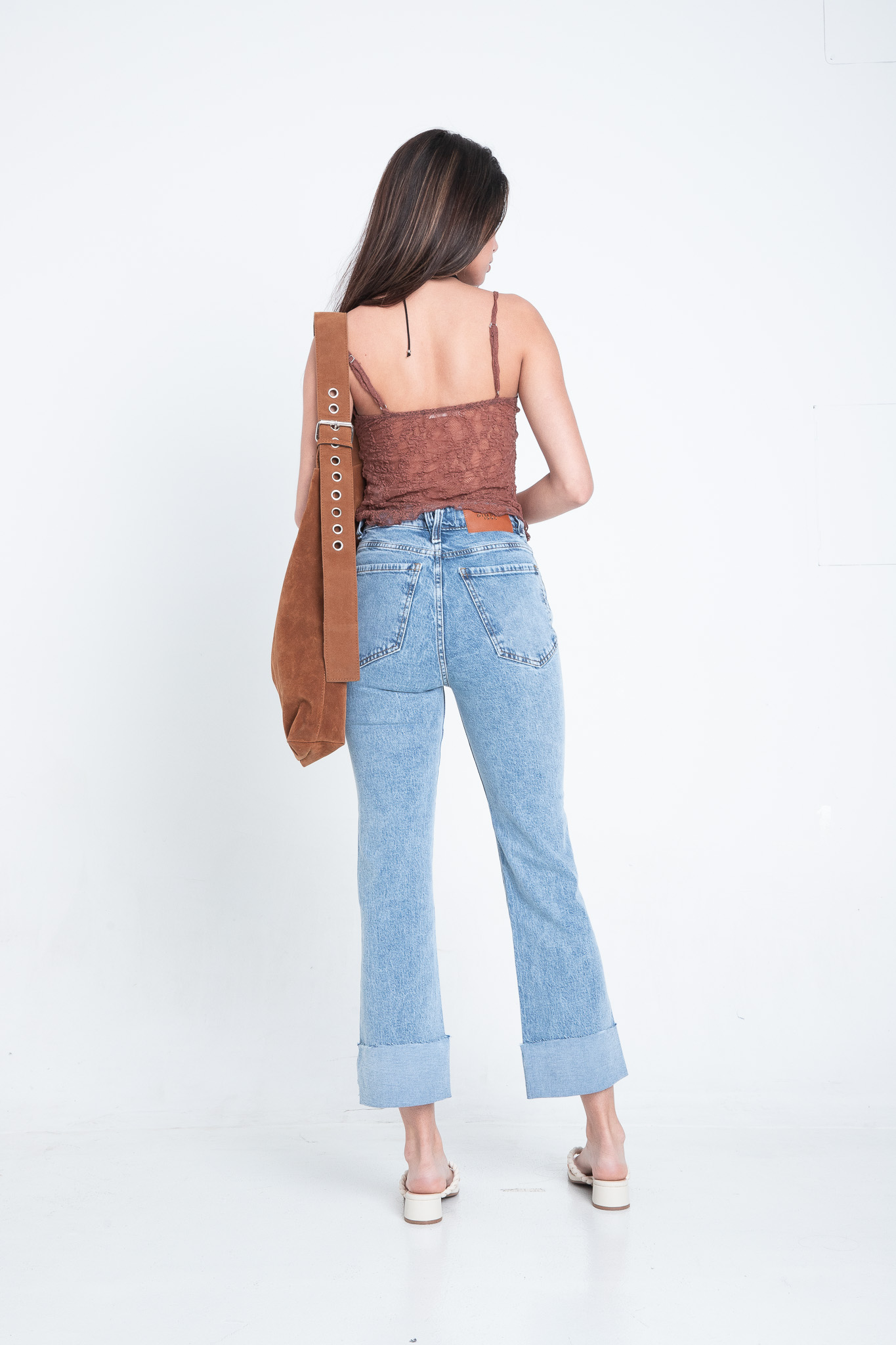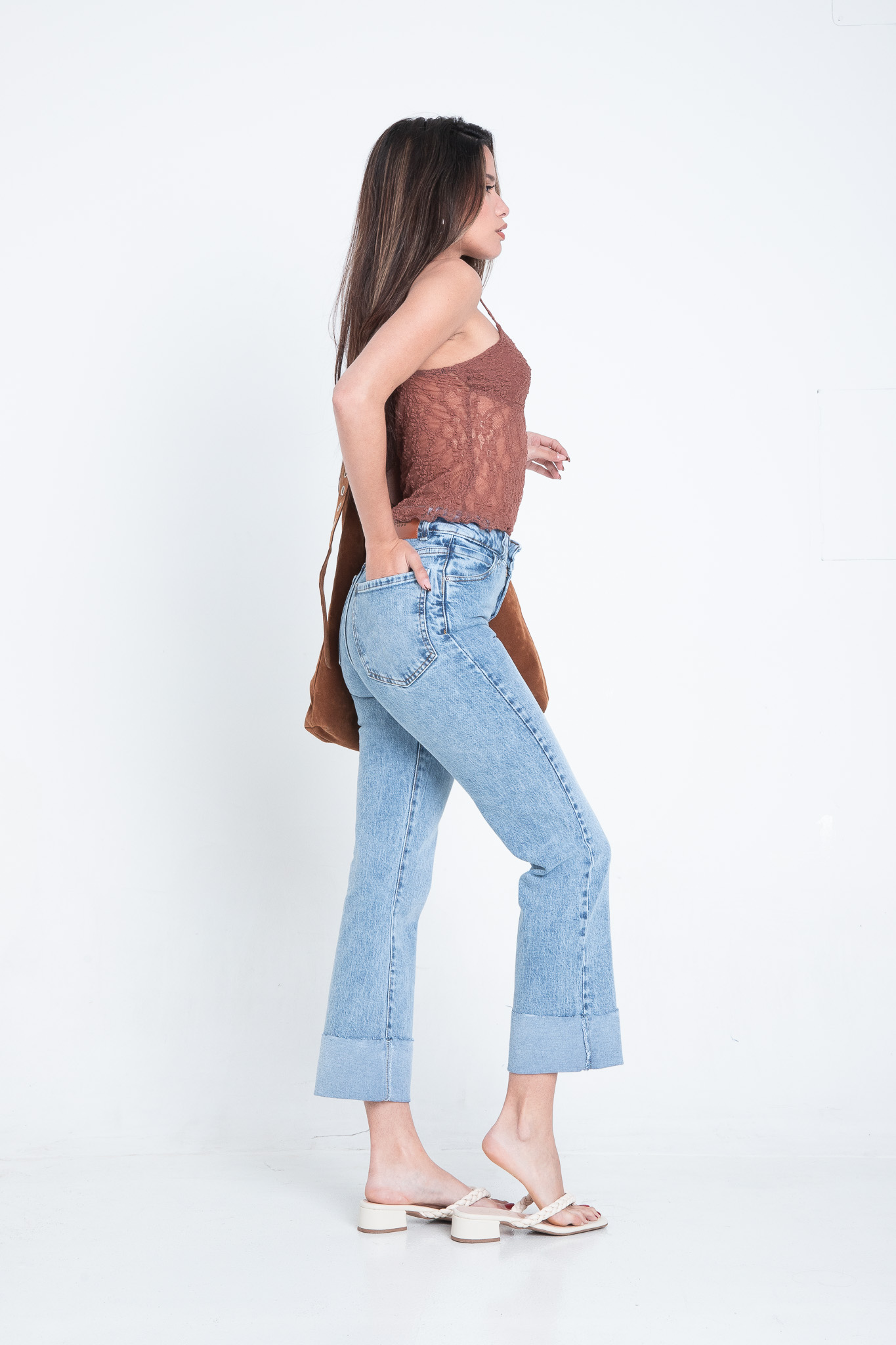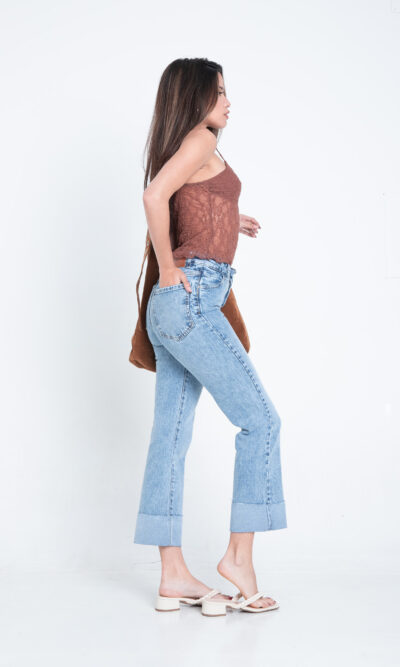 Panralon flare celeste navado. Con ruedo en reversa , tiro medio. Confort