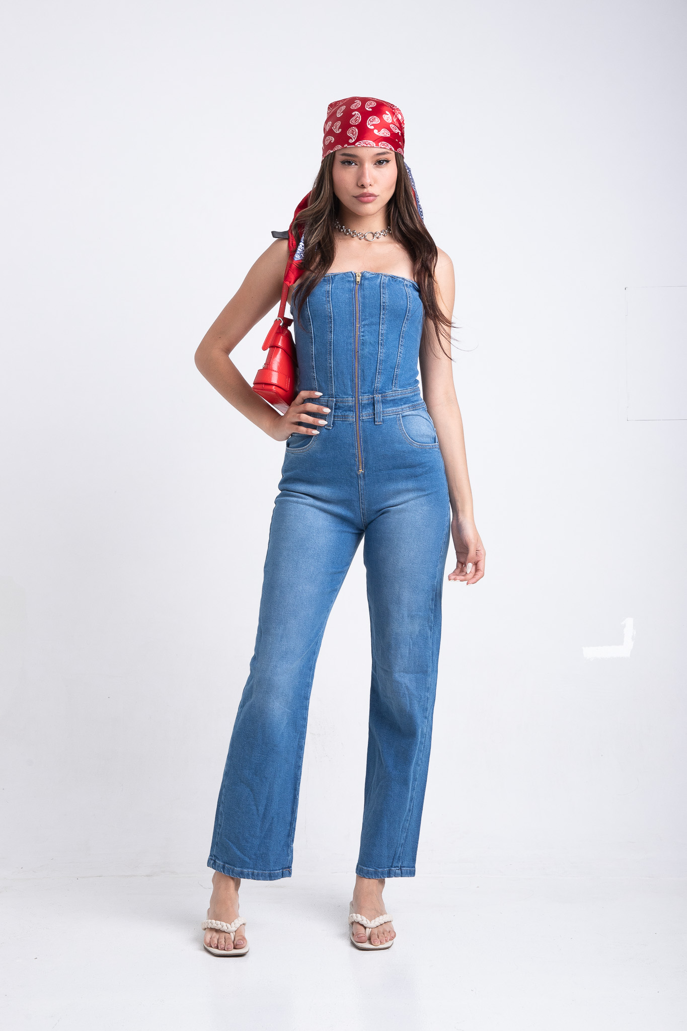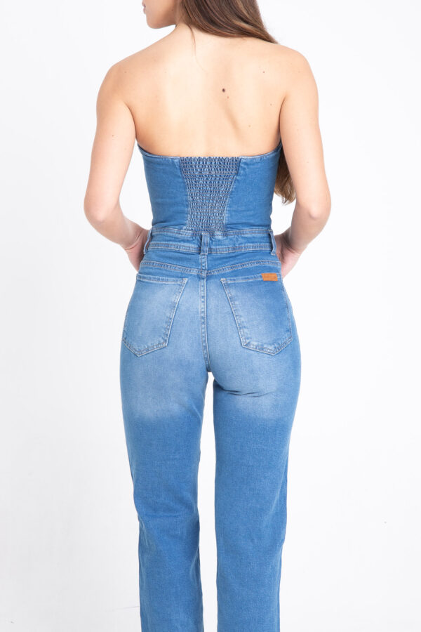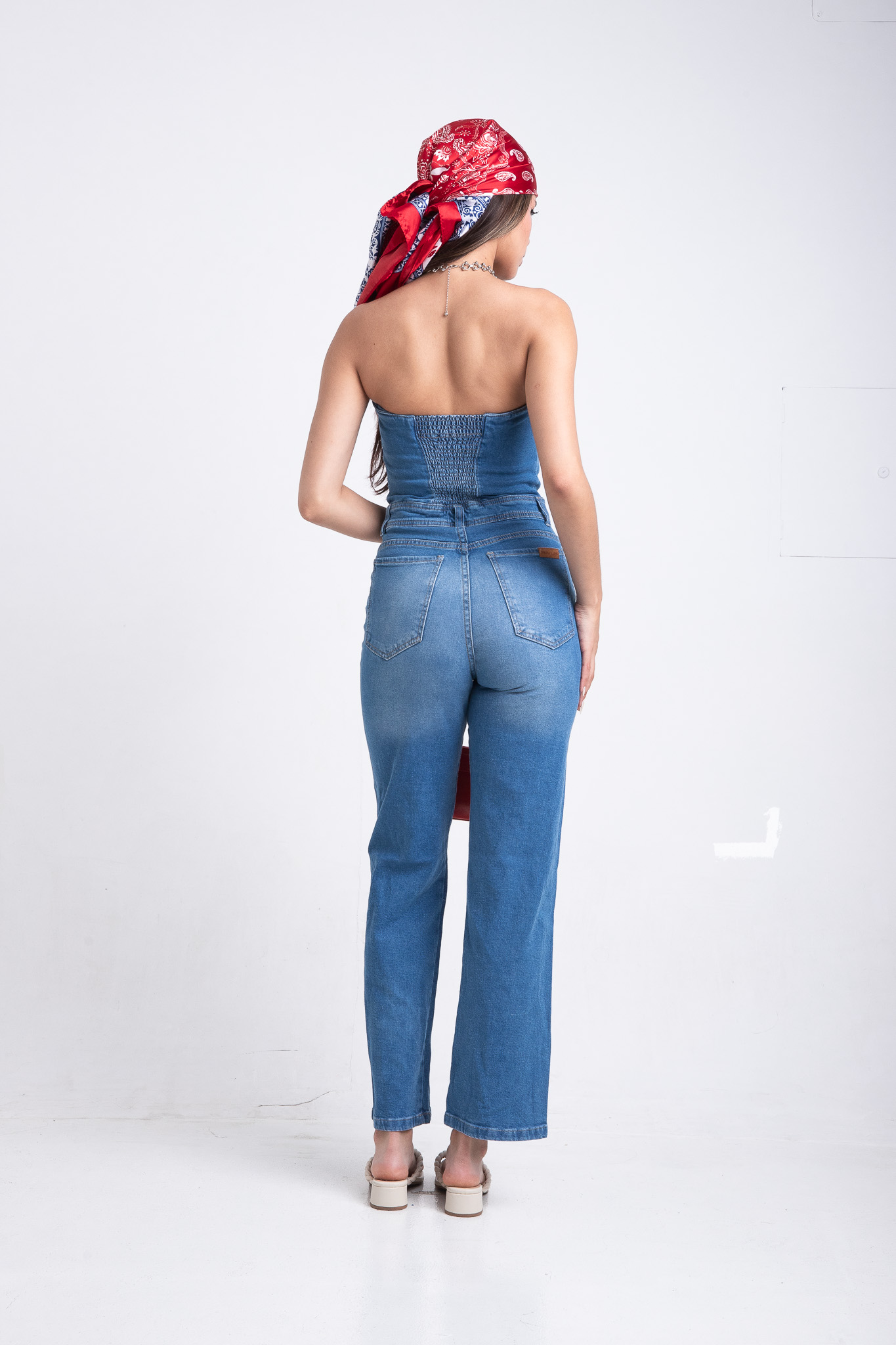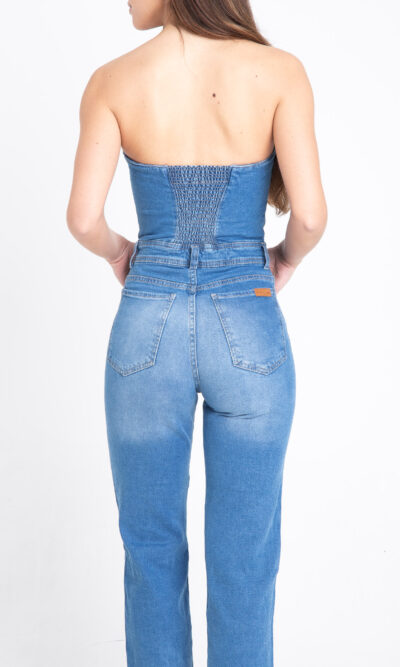 Mono prenda azul, strapless, con cierre y elastico en las espalda. Semi rigido.