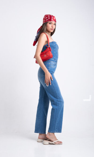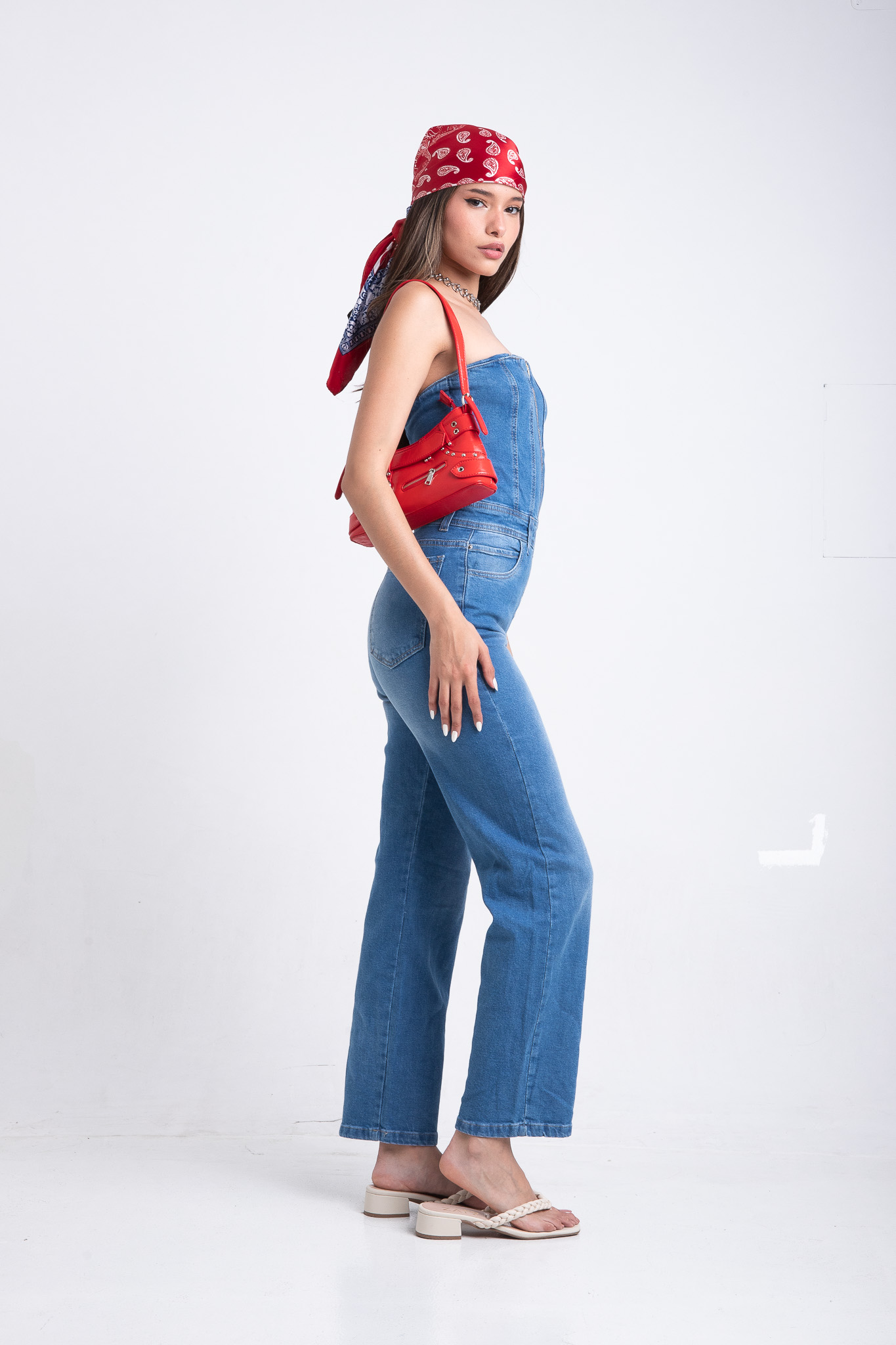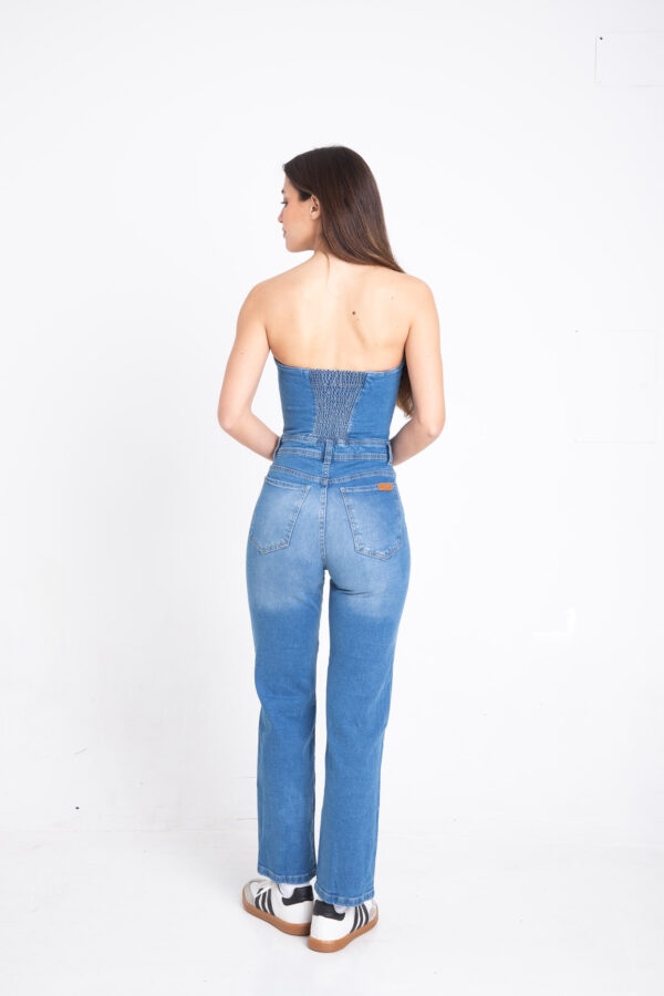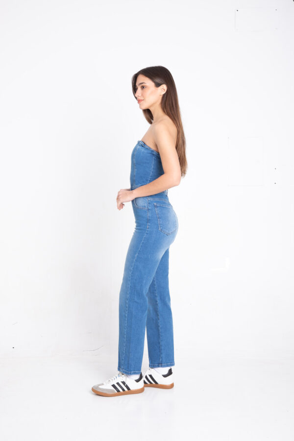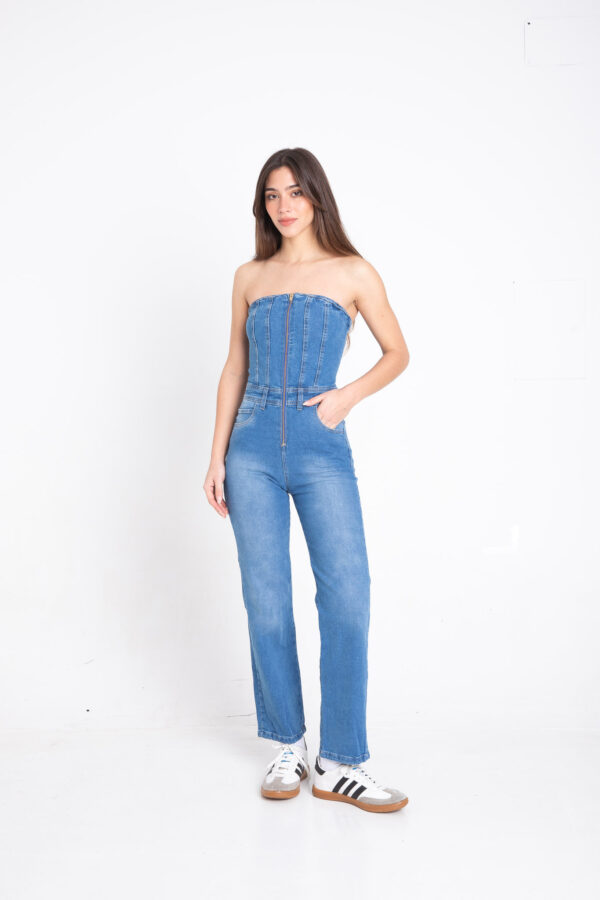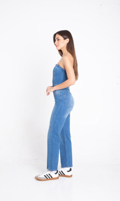 Mono prenda azul, strapless, con cierre y elastico en las espalda. Semi rigido.
