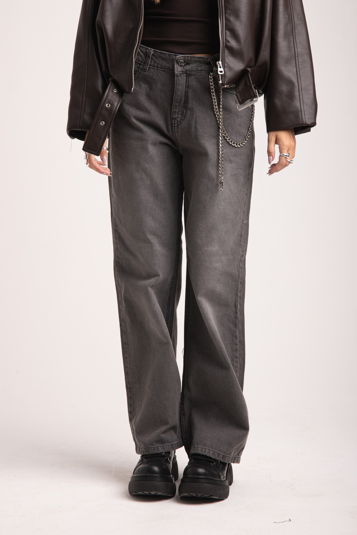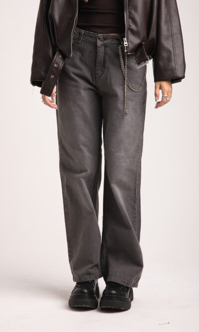 Pantalon recto gris. Tiro medio. Rigido.
