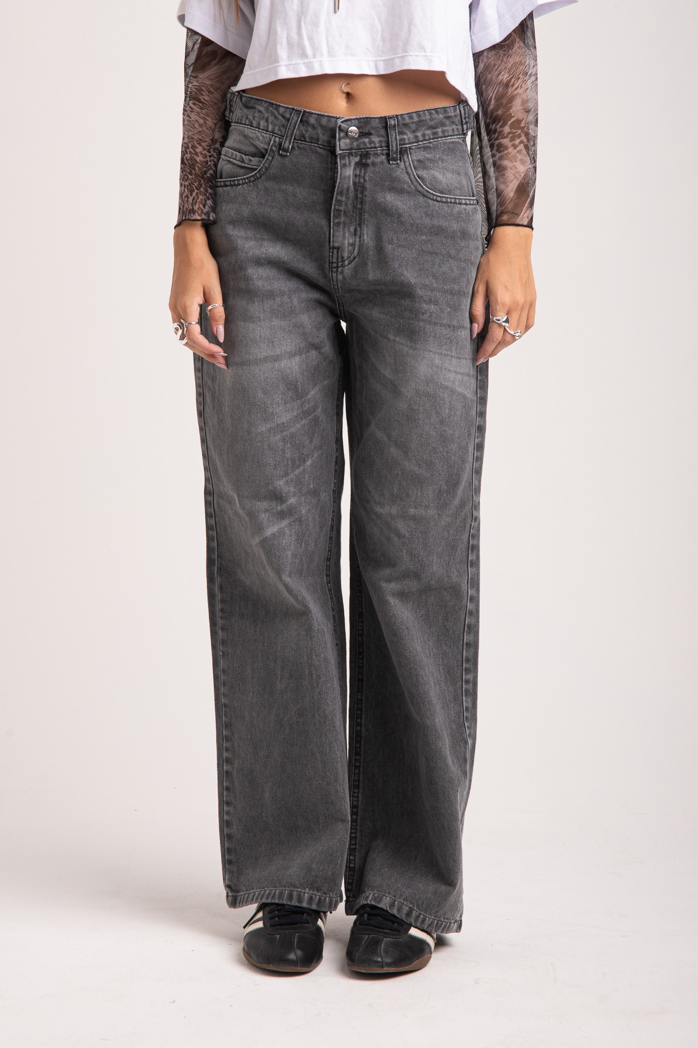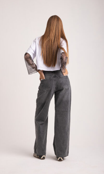 Pantalon recto gris, con cintura ajustable. Tiro medio alto. Rigido.