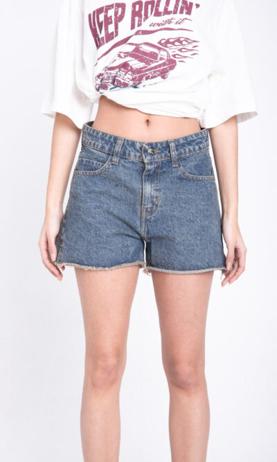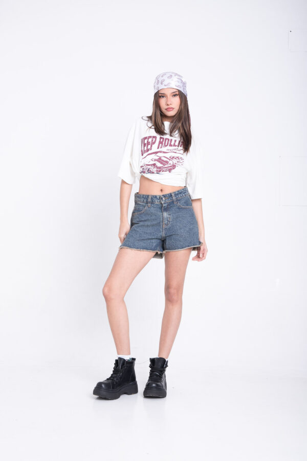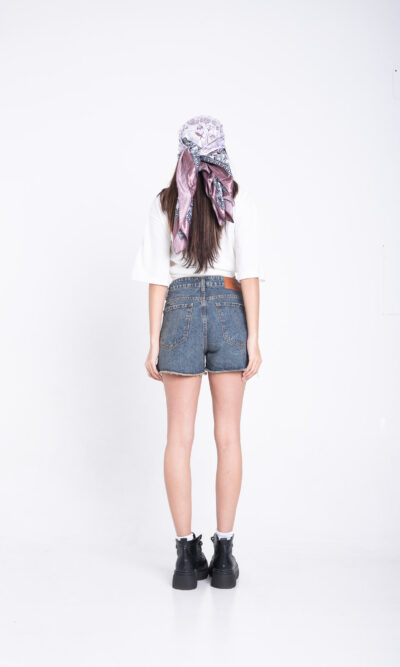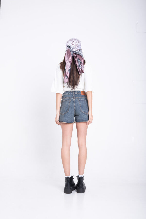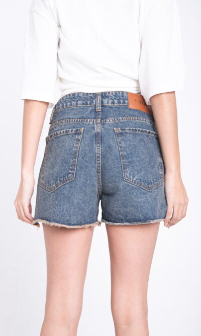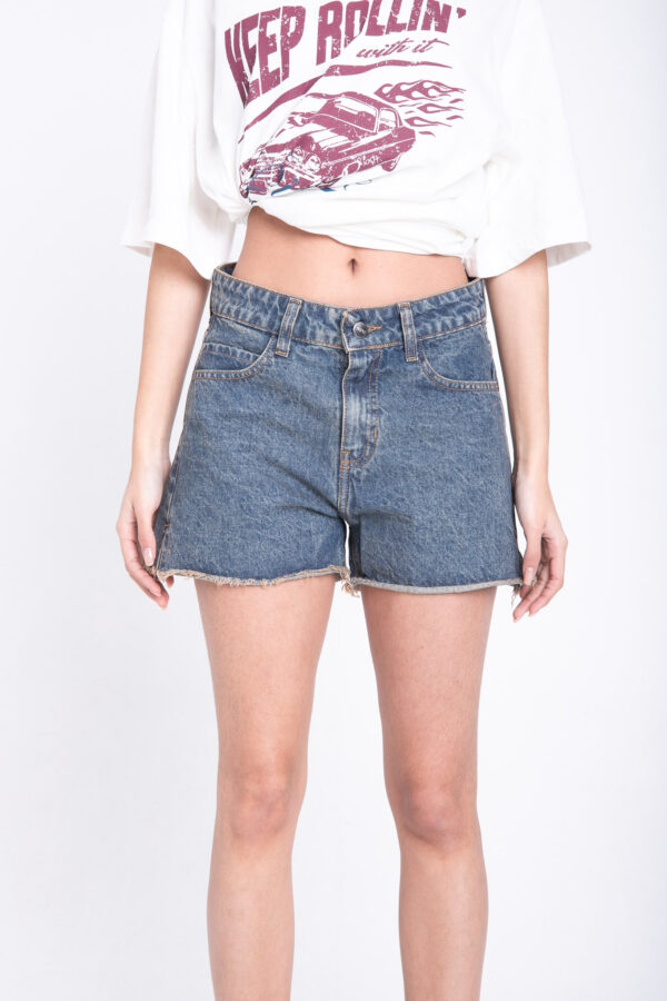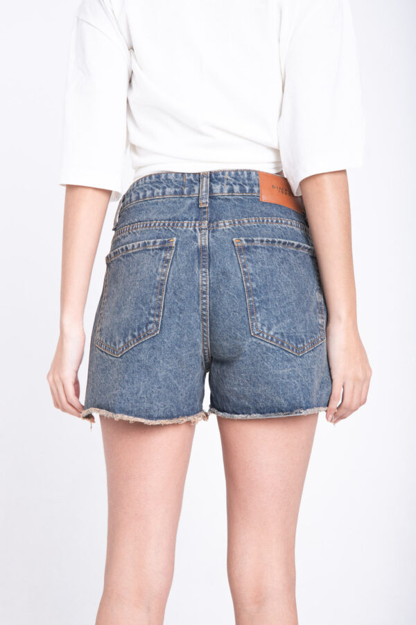Short matizado, con ruedo desflecado,tajos laterales, tiro medio. Rigido.
