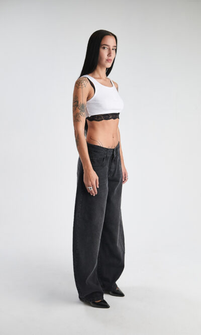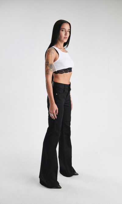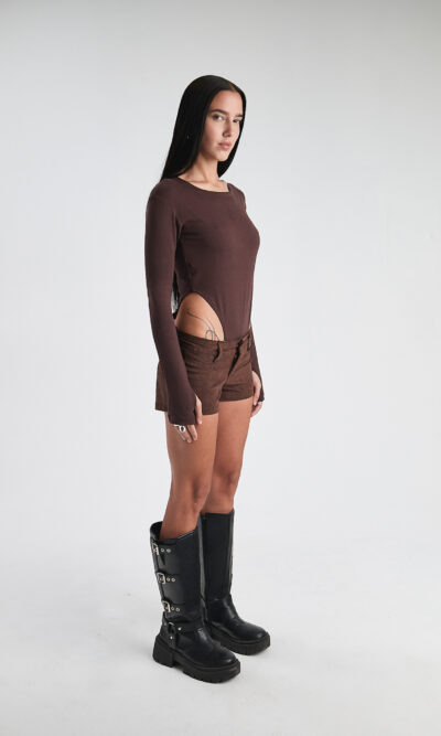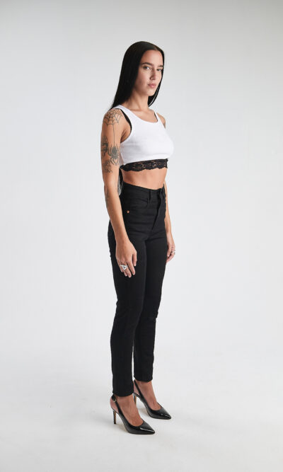 Short negro,ruedo rebatido. Super tiro bajo. Elastizado.