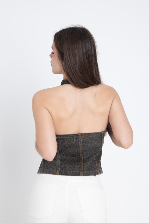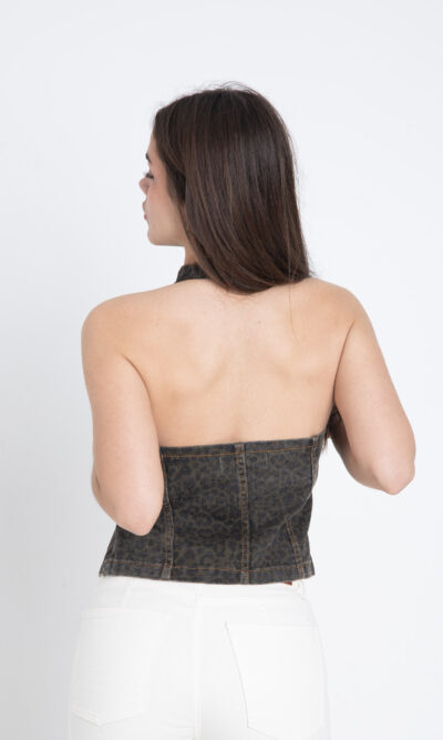 Top chaleco, halter, animal print con cierre y hebilla. Rigido.