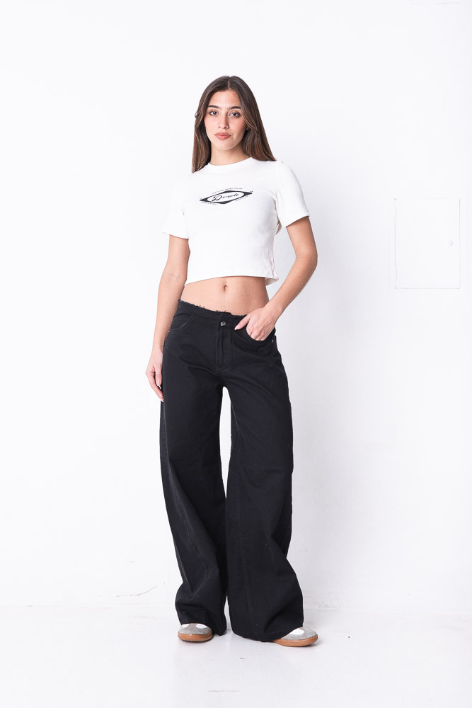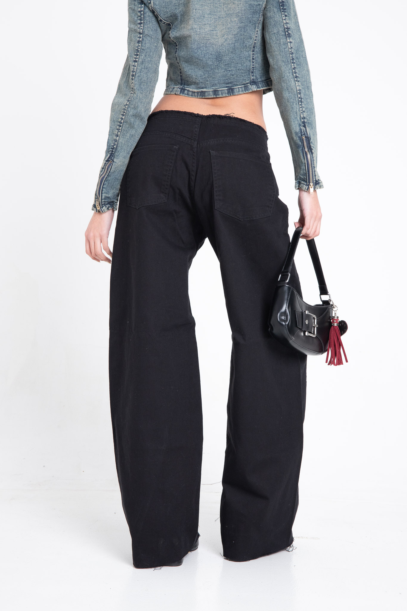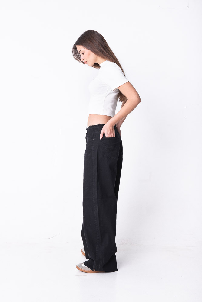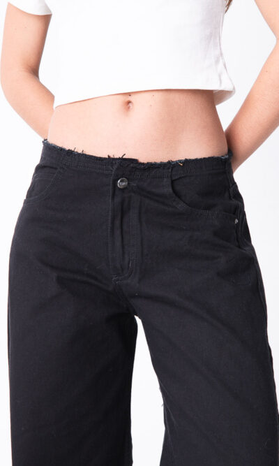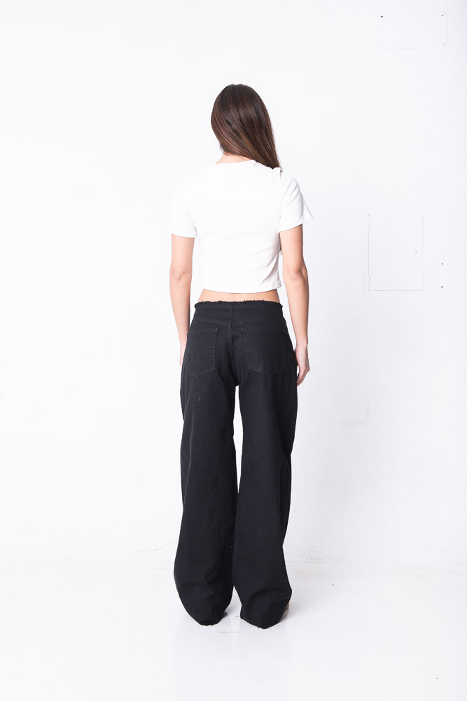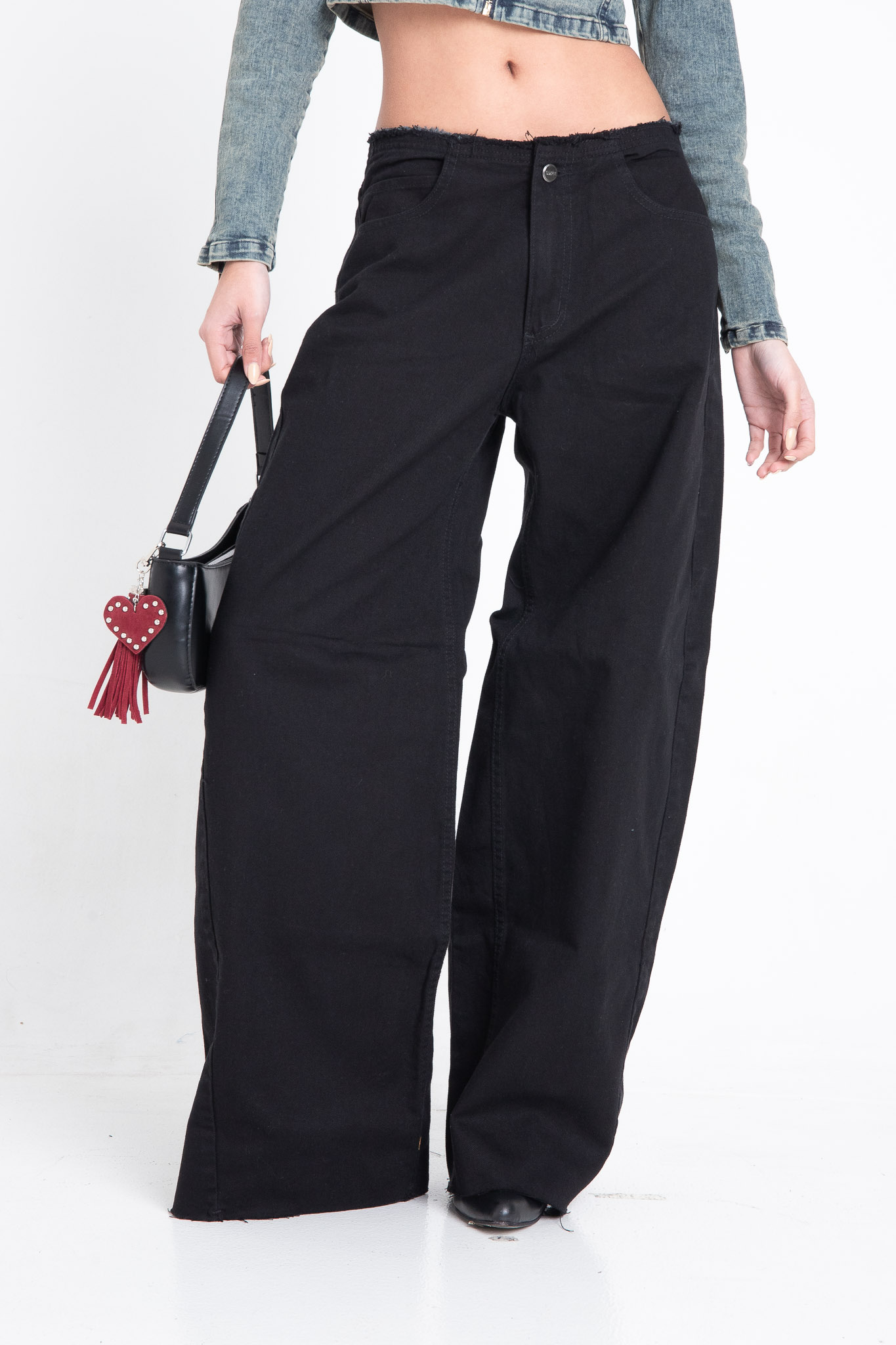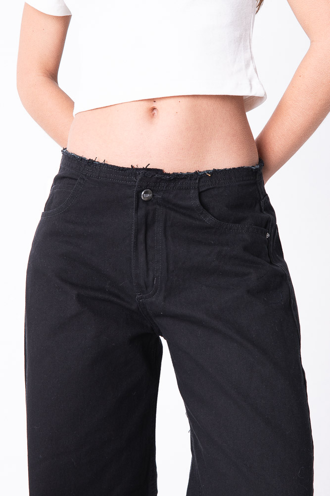Wide leg con cintura desflecada, sin ruedo, tiro bajo. Rigido