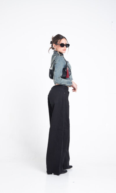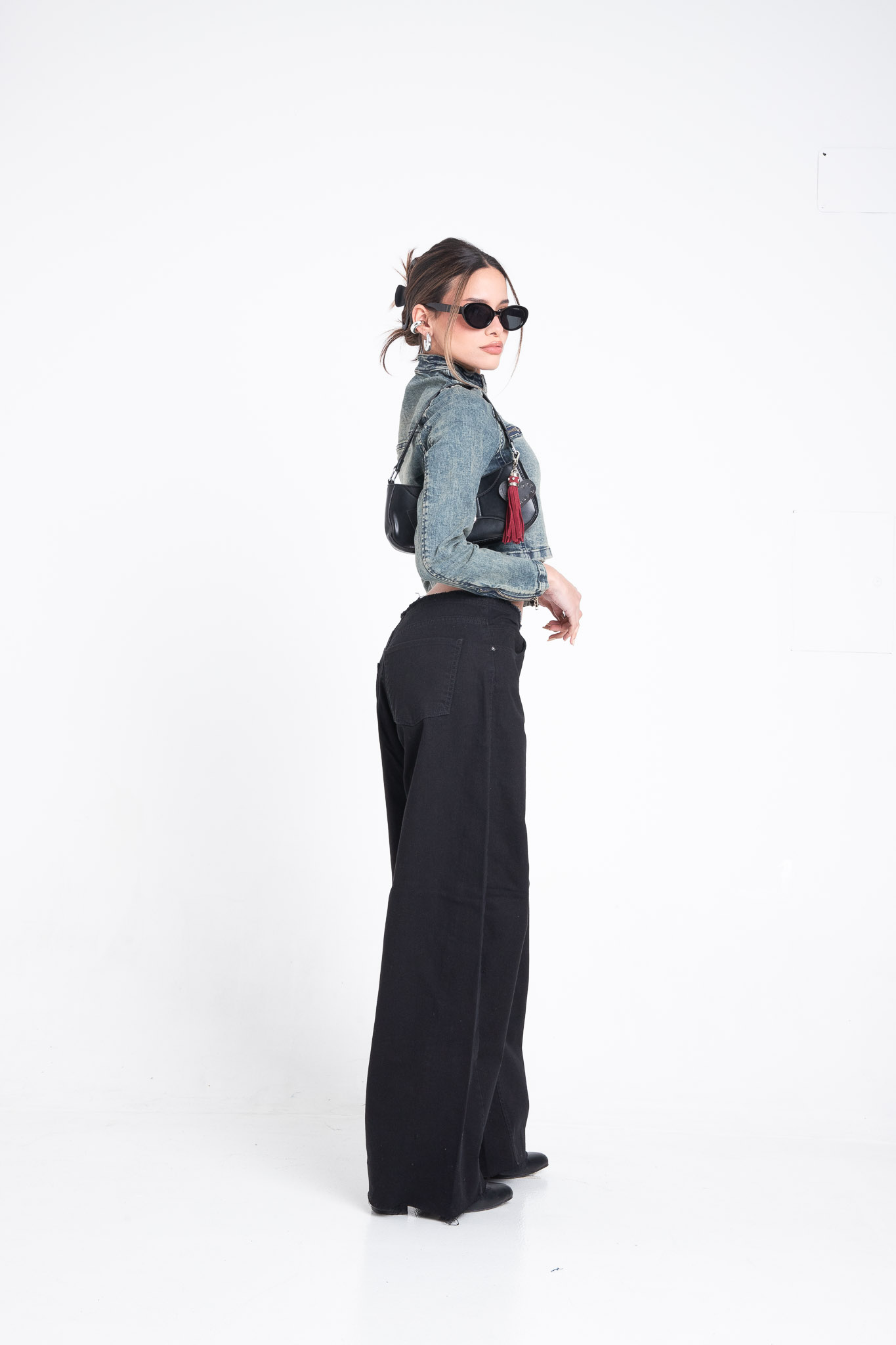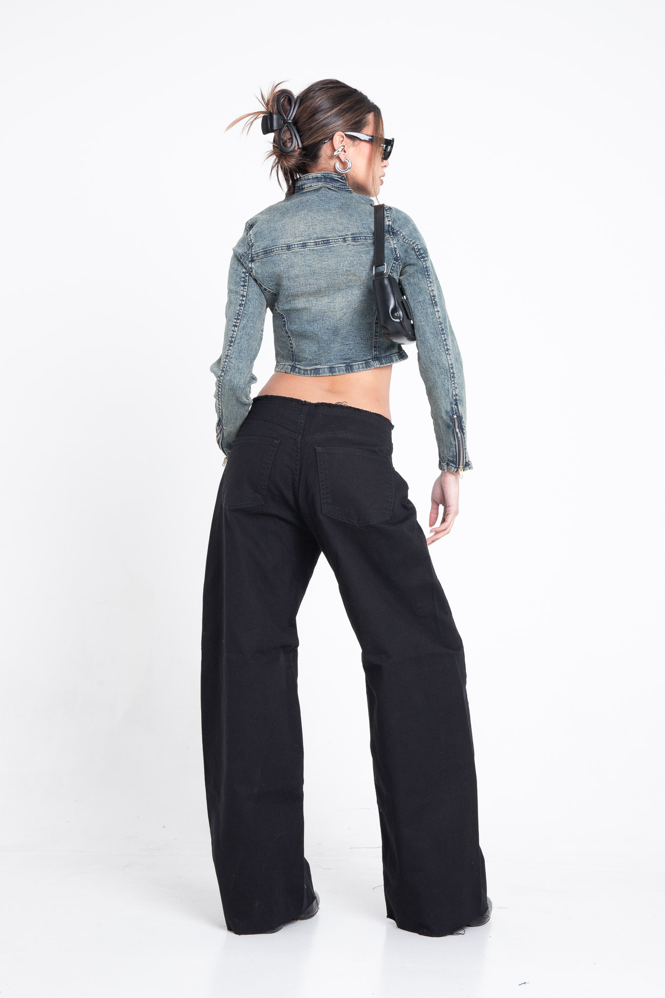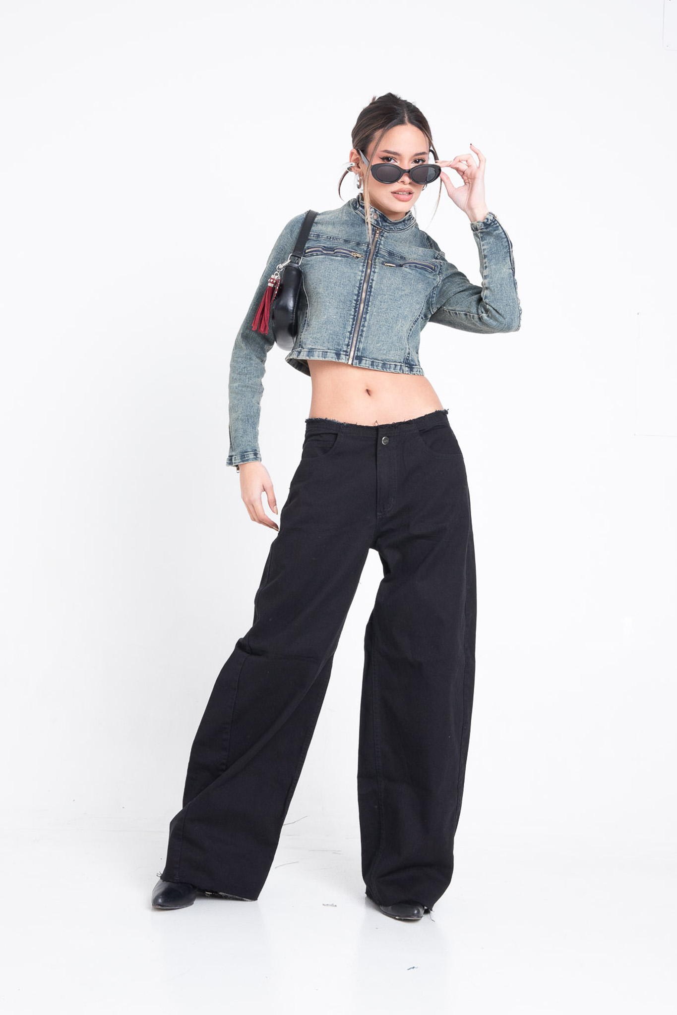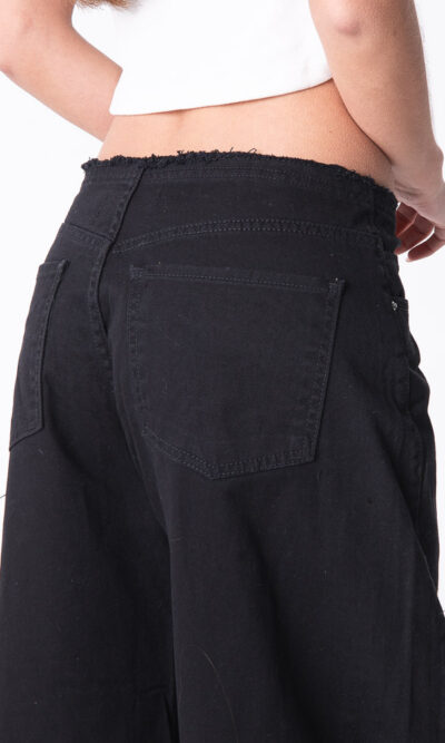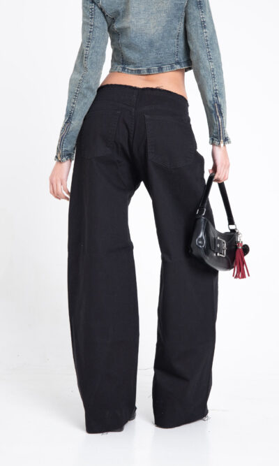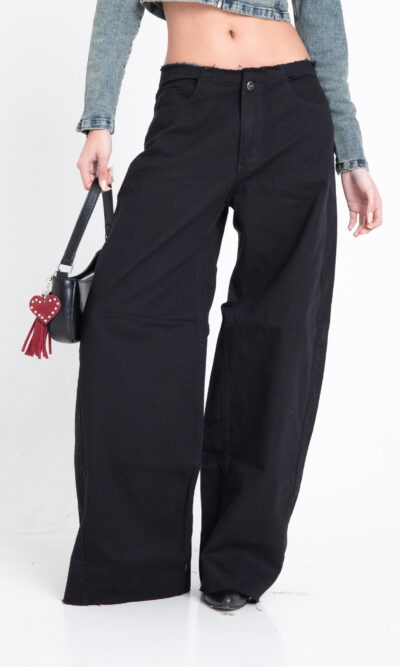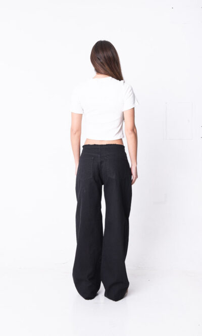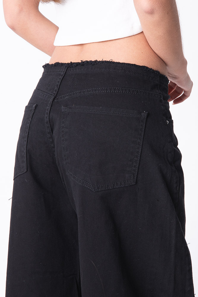 Wide leg con cintura desflecada, sin ruedo, tiro bajo. Rigido