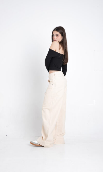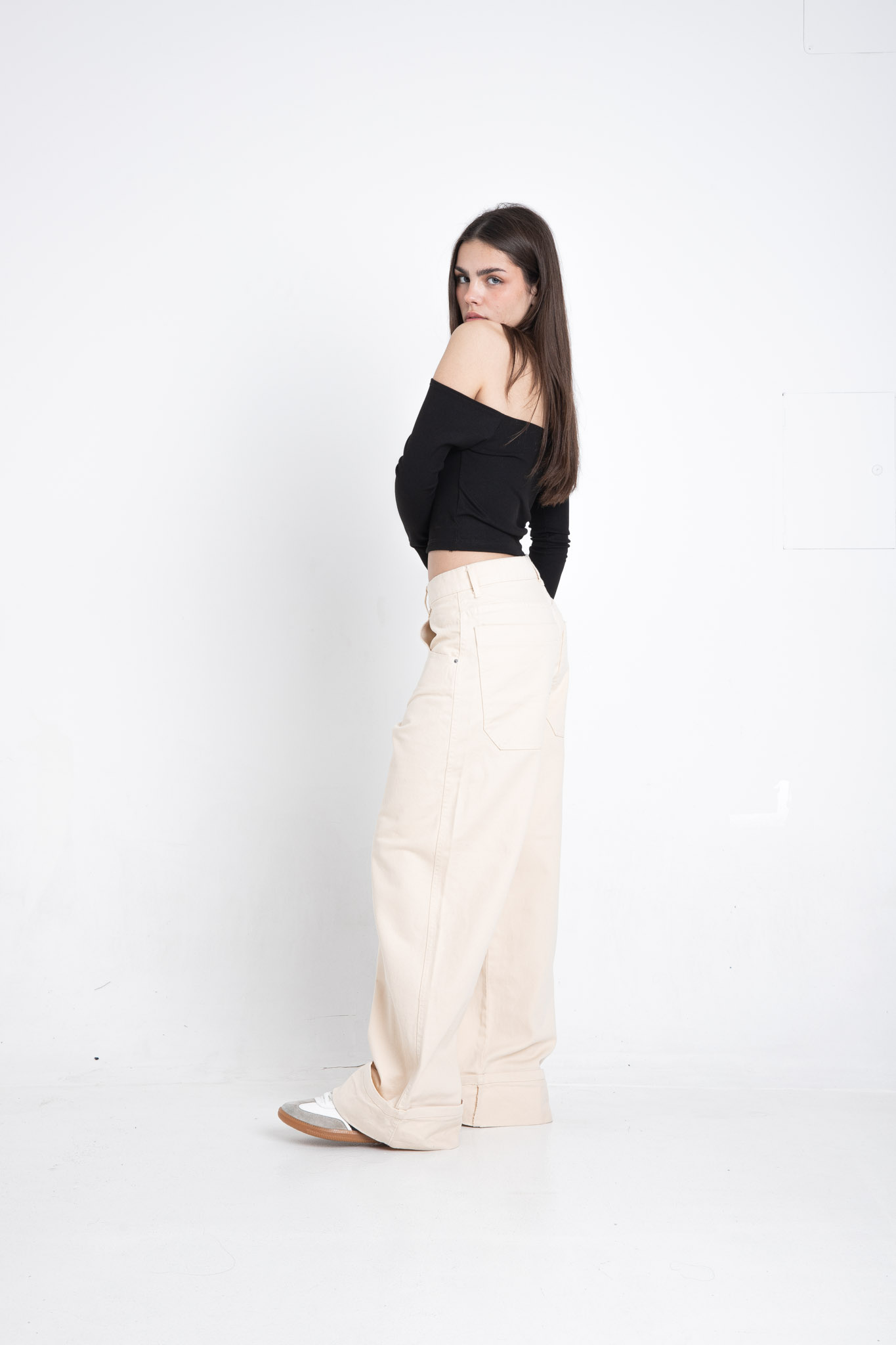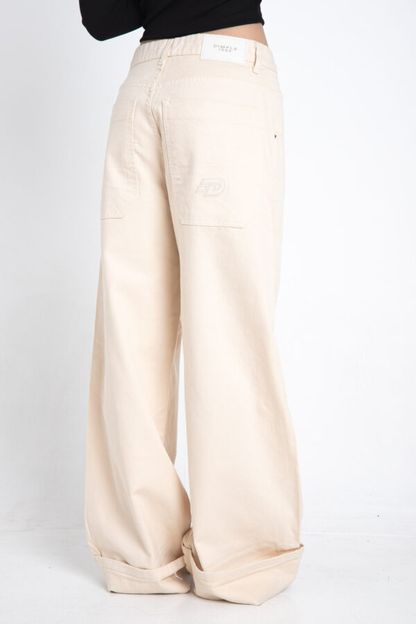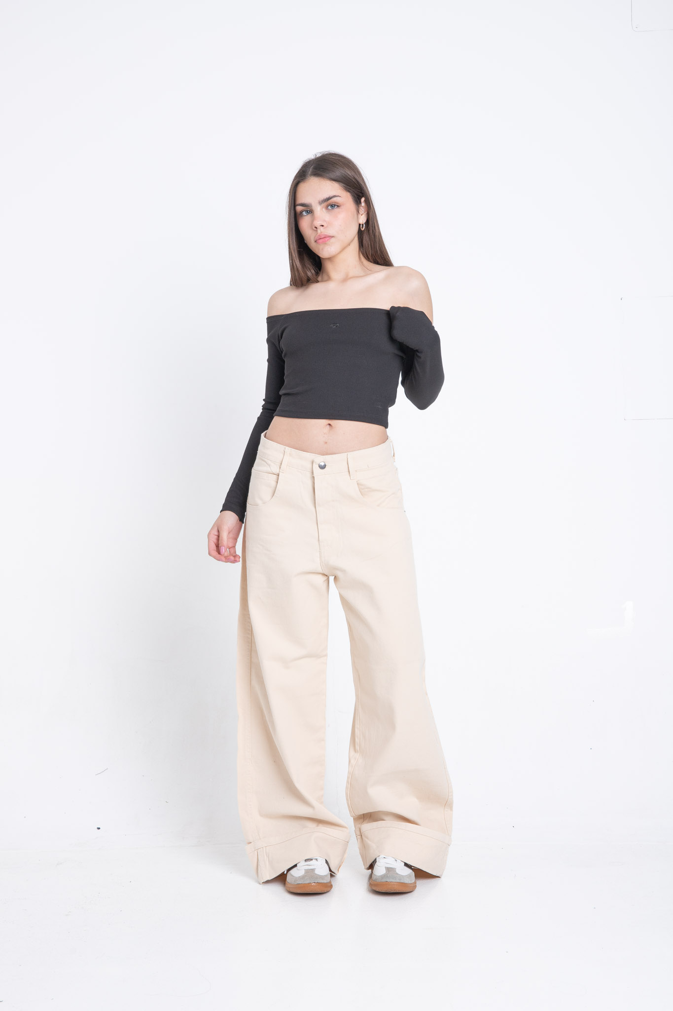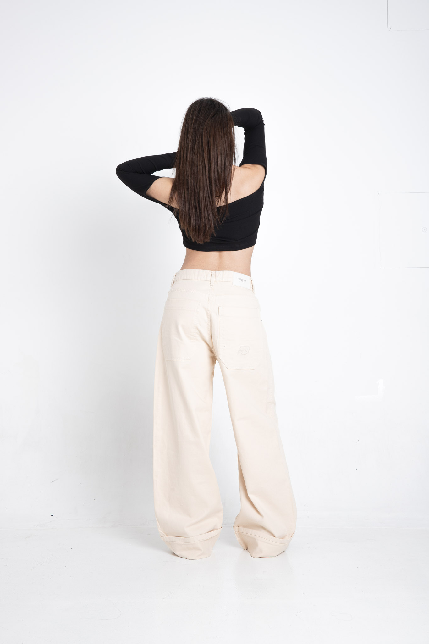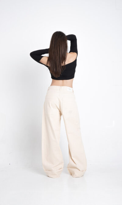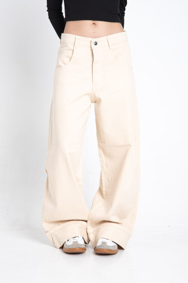 Wide leg/baggy beige, ruedo rebatido, bolsillo trasero bordad con logo al tono, tiro alto. Rigido.